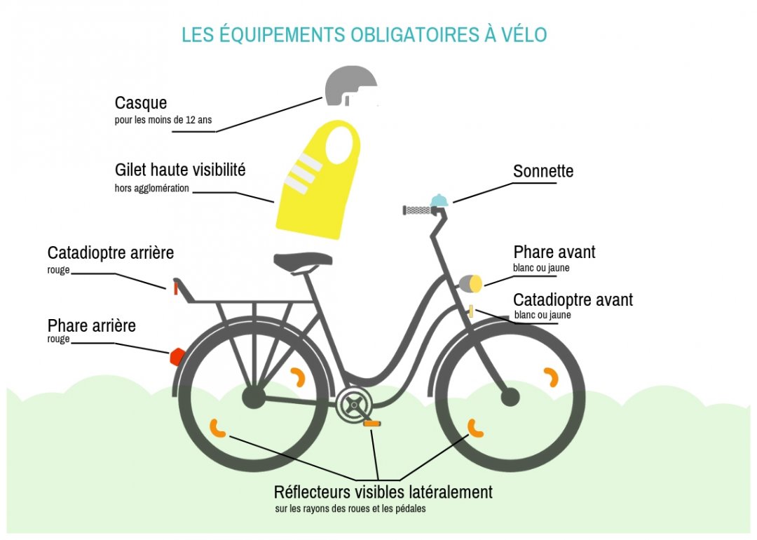 Un bon éclairage avant et arrière est indispensable (et obligatoire !) pour les cyclistes, de même que des réflecteurs sur les pédales et les roues. Hors agglomération, la nuit ou lorsque la visibilité est insuffisante, le port du gilet réfléchissant est également obligatoire.