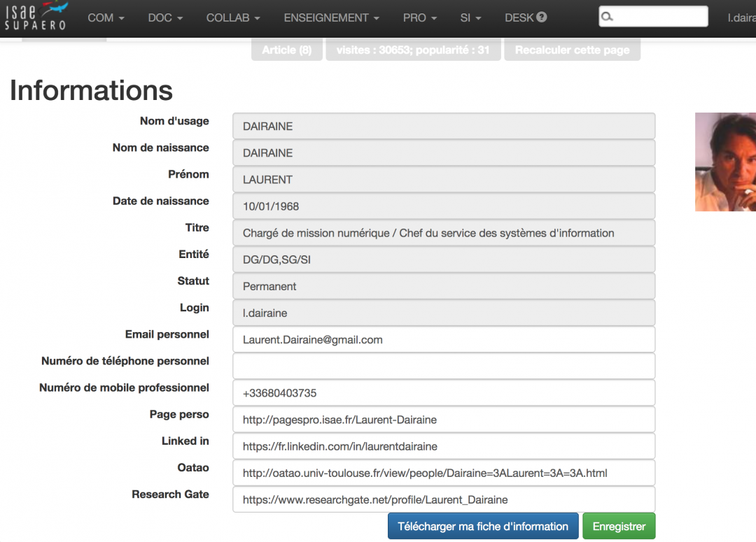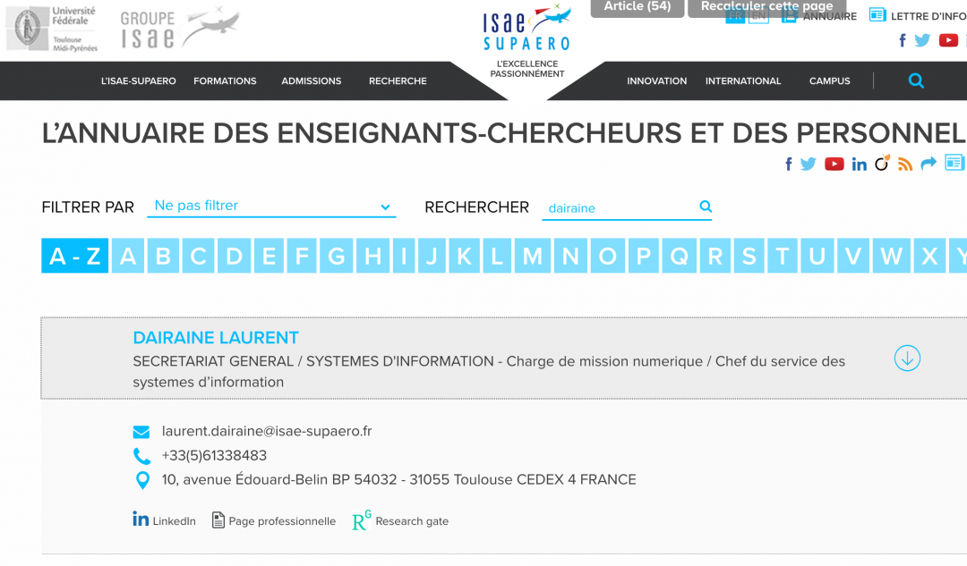 Les personnels en contact avec l’extérieur de l’ISAE-SUPAERO apparaissent dans l’annuaire disponible sur le site Web. Il est possible pour ces personnels de lier cette entrée dans l’annuaire avec son compte LinkedIn, OATAO, sa page pro ou encore sa page Research Gate, comme illustré dans la photo d’écran suivante.